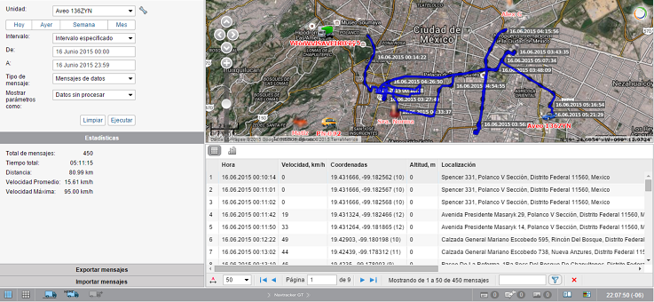 El panel de mensajes da acceso a las unidades de base de datos. Aquí puedes ver los mensajes recibidos desde las unidades (coordenadas, parámetros, velocidad, etc.), así como los mensajes SMS recibidos desde las unidades, los comandos enviados a unidades y eventos registrados en la historia de las unidades. Además, los mensajes de datos se pueden exportar a varios formatos.